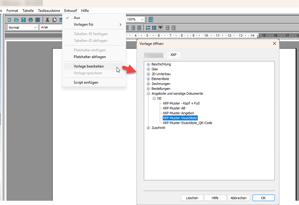 Das KKP bietet eine Dokumentvorlage zum Erstellen von Stücklisten an. Diese Vorlage kann man sich kopieren und für eigene Zwecke anpassen.